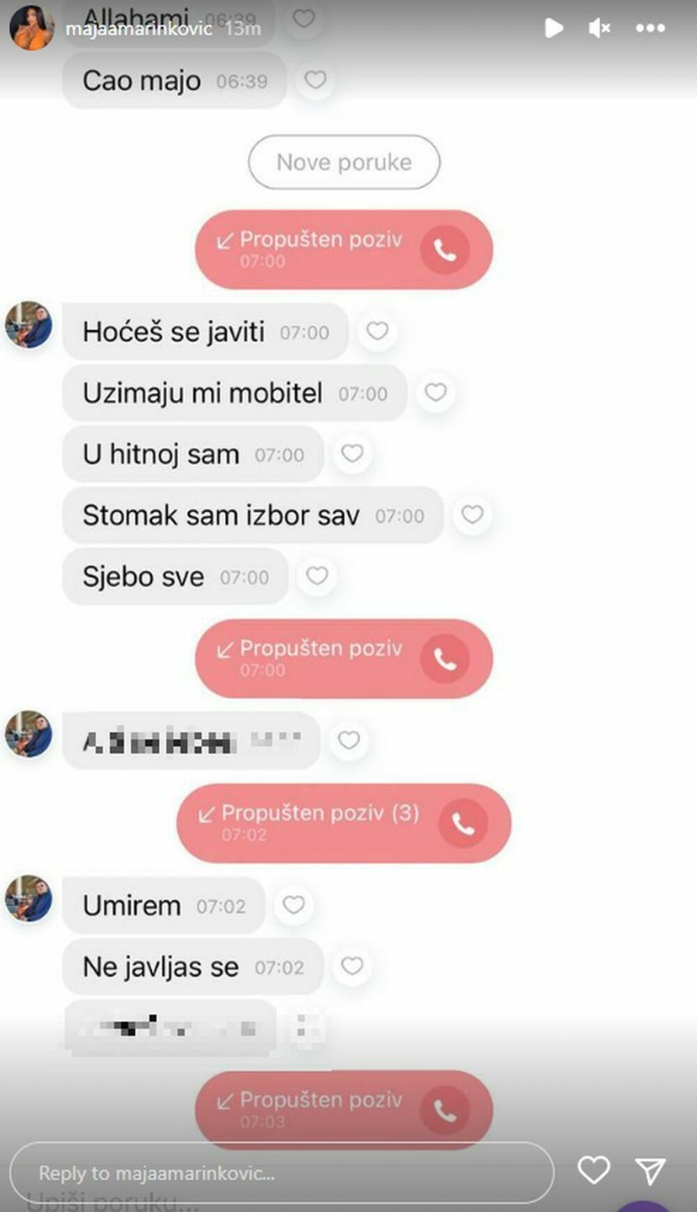 Maja je obelodanila i poruke, gde se može videti da joj Bilal preti, te joj je u jednom trenutku napisao i da će izvršiti samoubistvo zbog nje.