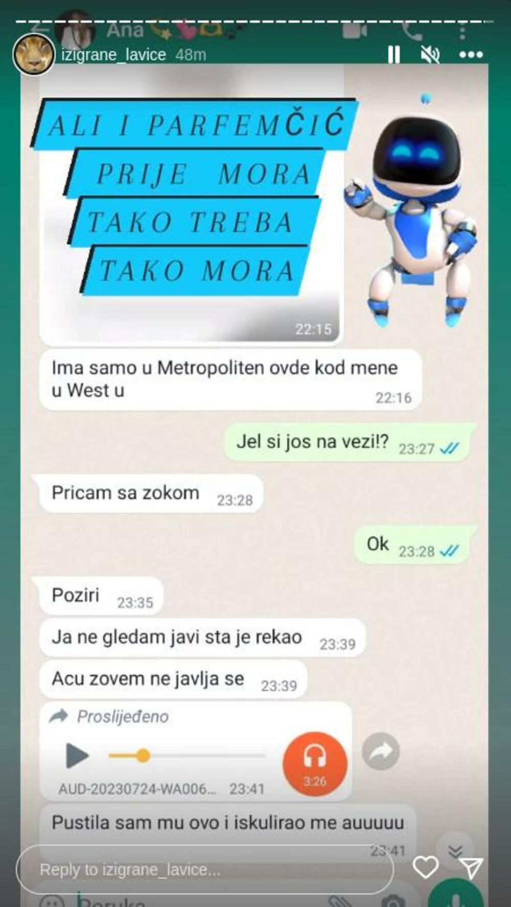 - Acu zovem ne javlja se, pustila sam mu ovo i iskulirao me! - napisala je Ana.