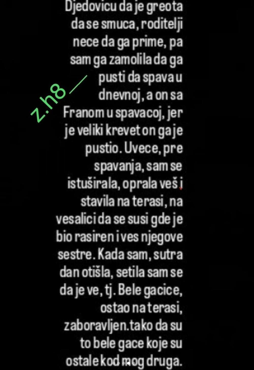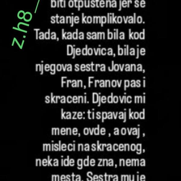 - Tada sam bila kod Đedovića, bila je njegova sestra Joavana tu, Fran, Franov pas i skraćeni. Đeodvić mi je rekao: "Ti spavaj kod mene, a ovaj skraćeni neka ide gde zna, za njega nema mesta". Sestra mu je otišla kod dečka, a ja sam spavala u njenoj sobi. Rekla sam Đedoviću da je greota da se smuca, da roditelji neće da ga prime, pa sam ga zamolila da spava u dnevnoj, a on sa Franom u spavaćoj jer je veliki krevet, i pustio ga je - istakla je Marija.đ