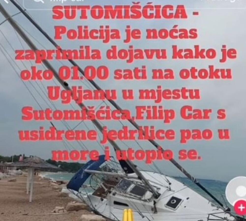 - Policija je noćas primila dojavu kako je jedan sat nakon ponoći na otoku Ugljanu u mestu Sutomiščica, Filip Car sa usidrene jedrilice pao u more i utopio se - stoji u objavi na Instagramu.