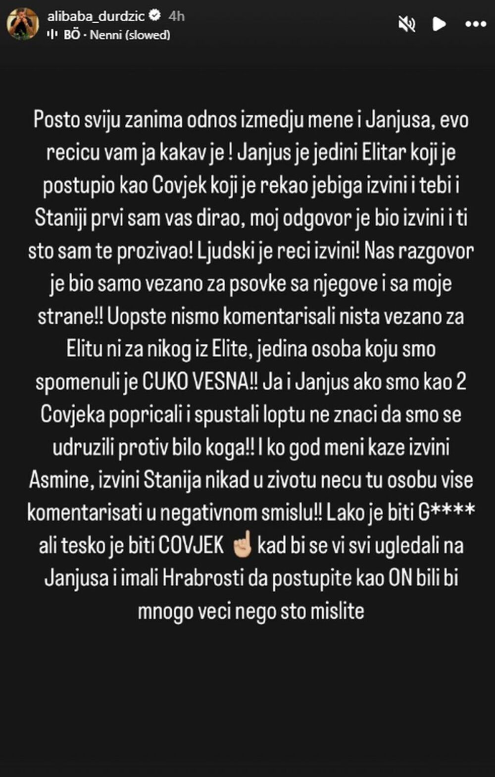 - Jedina osoba koju smo spomenuli jeste njegovo kuče, Vesna. Janjuš i ja smo kao dva čoveka popričali i spustili loptu. To ne znači da smo se udružili protiv protiv nekoga. Ko god meni kaže: "Izvini Asmine, izvini Stanija", nikad tu osobu neću više komentarisati u negativnom kontekstu. Lako je biti g*vno, ali teško je biti čovek. Kada bi se svi ugledali na Janjuša i imali hrabrosti da postupe kao on, bili bi mnogo veći nego što mislite.