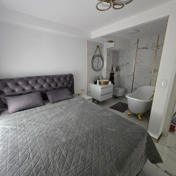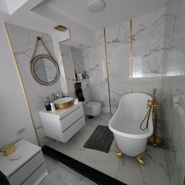 Naime, u neposrednoj blizini od kreveta u spavaćoj sobi, ima i malo kupatilo, tj. kadu i šolju, a ivice su, sudeći po fotkama, zlatne boje.