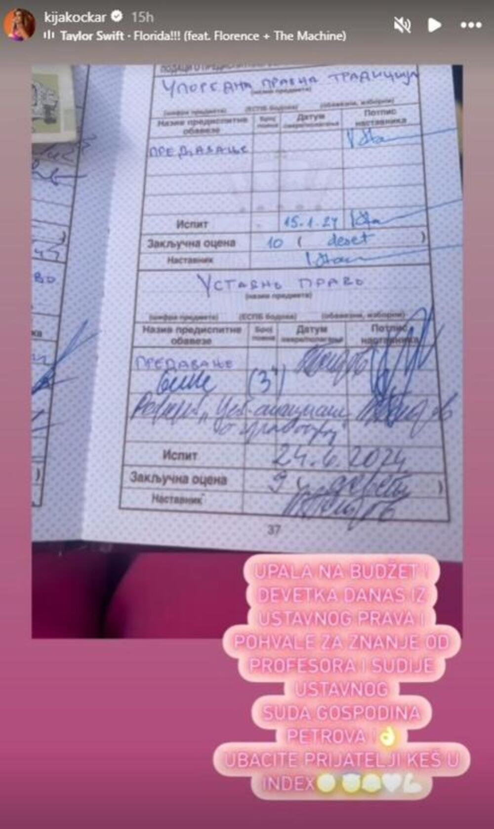 - Konačno zvanično završena prva godina Pravnog fakulteta u roku, sa prosekom 9 - saopštila je Kija, pa dodala: