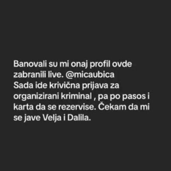 - Banovali su mi profil i zabranili lajvove. Sad ide krivična prijava za organizovani kriminal, pa po pasoš i karte da se rezerviše. Čekam da mi se jave Velja i Dalila - napisala je, a potom i objavila pomalo konfuznu prepisku sa Dalilom.
