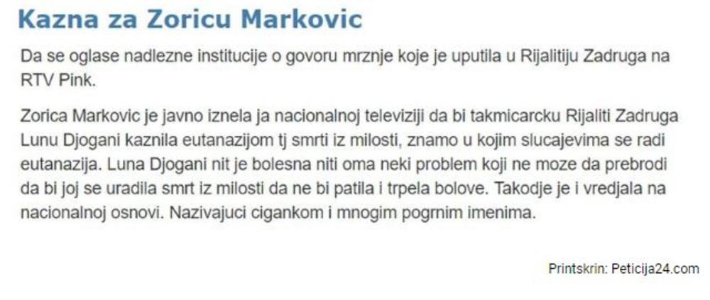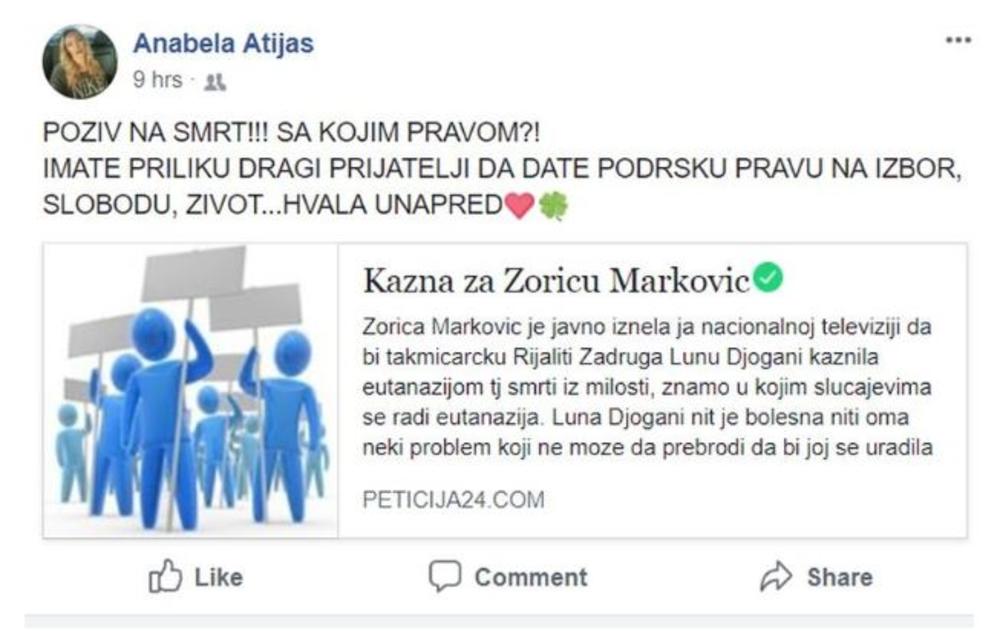 Anabela Atijas pozvala je ljude da potpišu peticiju kojom se apeluje da se Zorica Marković kazni pošto je u rijaliti progamu Zadruga navodno rekla kako bi Lunu Đogani kaznila eutanazijom.