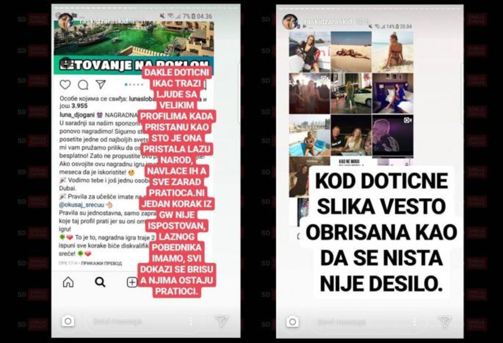 Radi se o tome da je Luna navodno sklopila dogovor sa jednom stranicom na Instagramu, kako bi dobila veći broj pratioca. Ta stranica je pokrenula nagradnu igru, putovanje u Dubaji, a Luna ih je reklamirala, gde je jedan od uslova učešća bio i da je učesnici zaprate na toj društvenoj mreži.