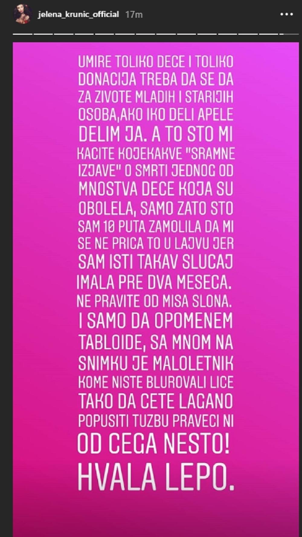 "Umire toliko dece i toliko donacija treba da se da za živote mladih i starijih osoba, ako iko deli apele, delim ja. A to što mi kačite kojekakve "sramne izjave" o smrti jednog od mnoštva dece koja su obolela, samo zato što ssam 10 puta zamolila da mi se ne priča to u lajvu jer sam isiti takav slučaj imala pre dva meseca", napisala je Jelena i dodala da će tužiti medije zbog snimka sa njenog storija na kom je bio maloletnik!