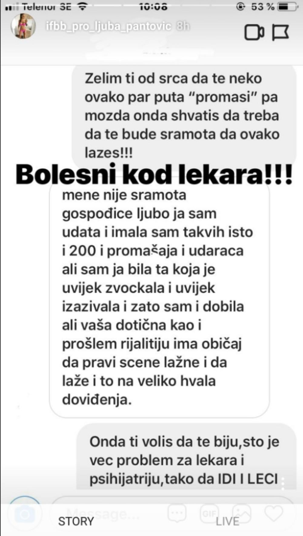 "Mene nije sramota, gospođice Ljubo. Ja sam udata i imala sam takvih isto 200 i promašaja i udaraca, ali ja sam bila ta koja je uvijek zvockala i zato sam i dobila. Ali Vaša dotična, kao i u prošlom rijalitiju, ima običaj da pravi scene lažne i da laže. i to na veliko", napisala je jedna gospođa, a Ljubin komentar na to je bio da bolesni treba da idu kod lekara.