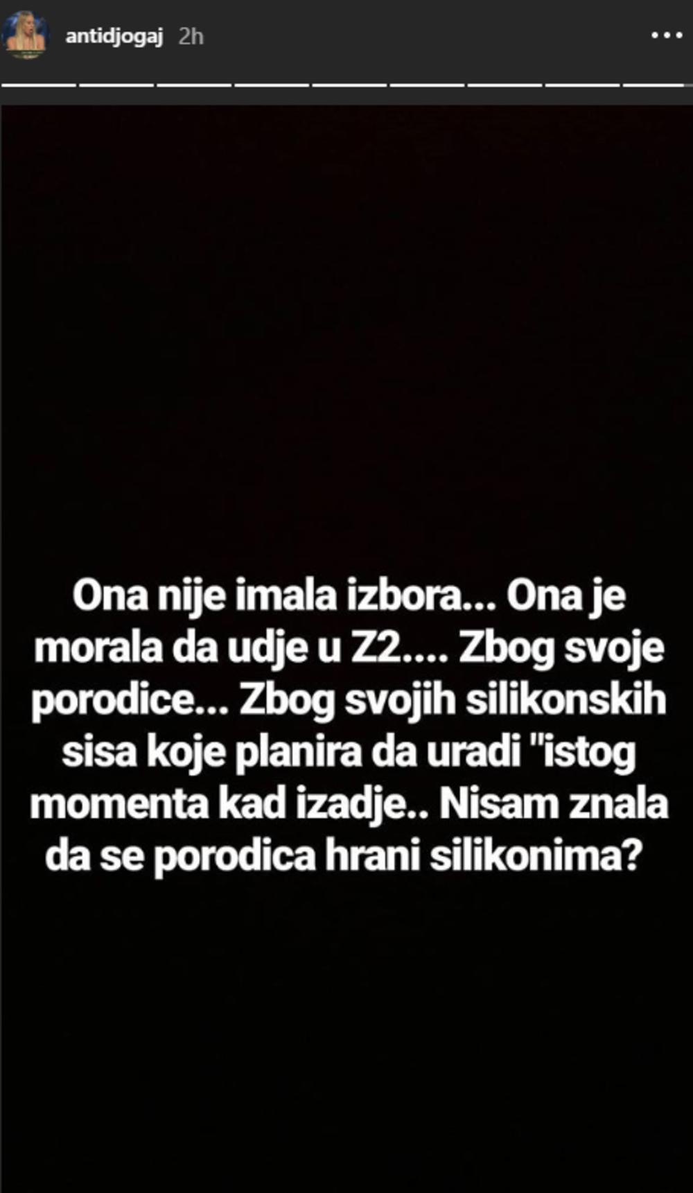 Blogerka je u više navrata otkako je ušla u Zadrugu 2 isticala kako je morala da uđe ponovo u rijaliti zato što niko više ne želi s njom da sarađuje, ali i zato što njeni roditelji zbog njene veze s oženjenim muškarcem više ne nastupaju, te da su takoreći na rubu egzistencije.