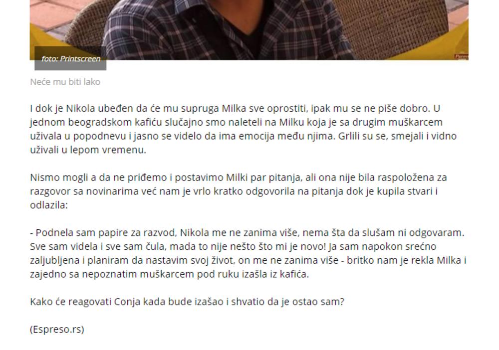 - Ne želim da više pričam o Nikoli, ne zanima me, podnela sam papire za razvod. Ja sam napokom srećno zaljubljena i više me ne zanima. Izjavila je Milka a onda otišla sa nepoznatim dečkom ruku pod ruku - pročitala je voditeljka tekst iz novina, te je Conja otkrio nešto o čemu je ćutao, ali niko nije poverovao u to, shodno njegovom pređašnjem Parografu: