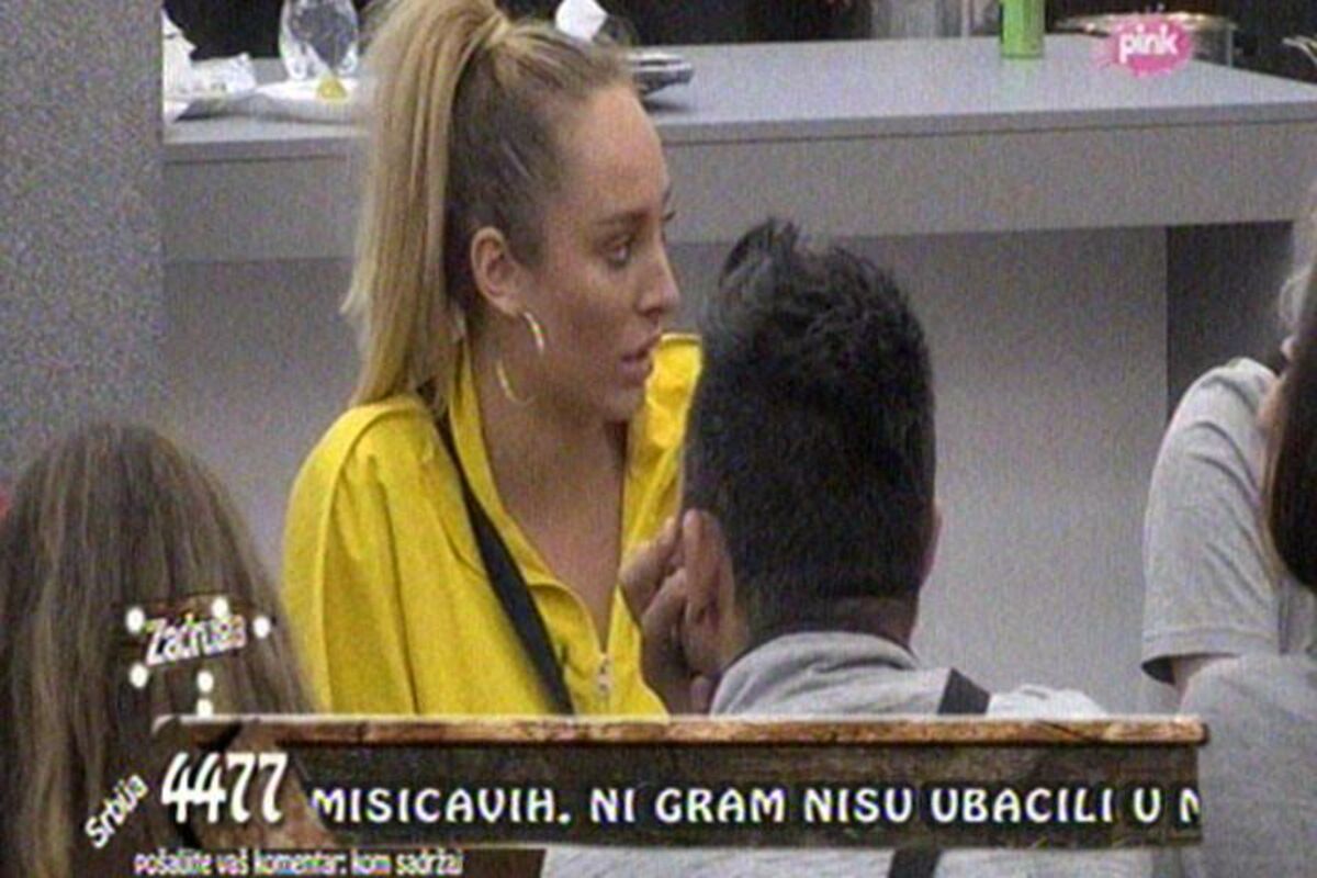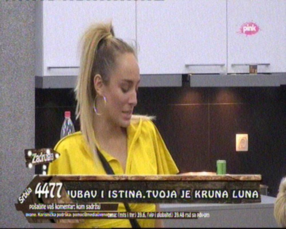 – Napolju smo sedeli Marko i ja. Pričali smo na neku temu. On je imao neki žeton za antistres i ispao mu je iz ruke. Bukvalno je ovako sam ispao. Stvarno smo izgovirli rečenicu: "To je neki znak!" Nakon toga smo bili ispred onog "fast food"-a i ja sam poljubila njega pozadi u obraz i onda sam pala sa stolice. Da nije bilo Baneta Čolaka, glavu bih izgubila verovatno. I tako je bilo par situacija kada sam ja skontala da mi neko napolju sigurno gata ili me bocka, kao ona vudu lutkica. Ne dozvoljava mi da se približim Marku tako da ću morati u buduće da se malo udaljim od Marka da se ne bih udavila u jezeru ili eventualno ili da mi ne bi pao kamen s neba - rekla je Luna i dodala: