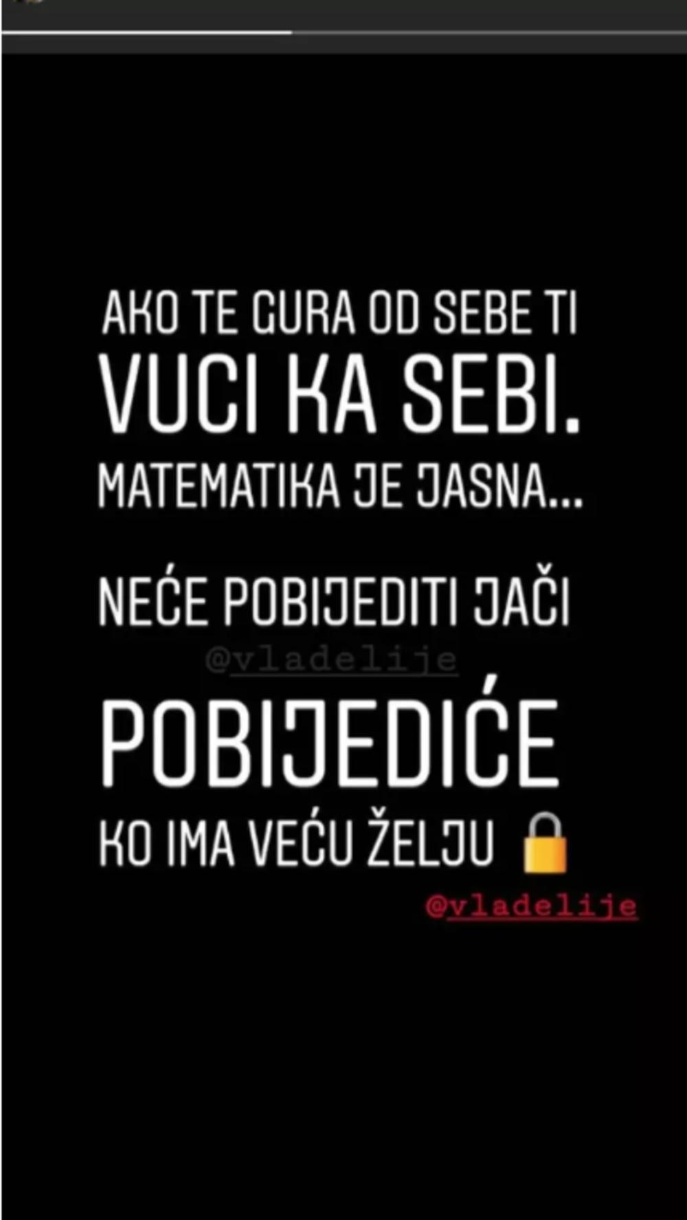 - Ako te gura od sebe, ti vuci ka sebi. Matematika je jasna. Neće pobediti jači, pobediće ko ima veću želju - piše u okviru njegovog storija, u kom je i katanac koji upućuje na onaj koji je zakačio na Mostu ljubavi u Vrnjačkoj Banji.