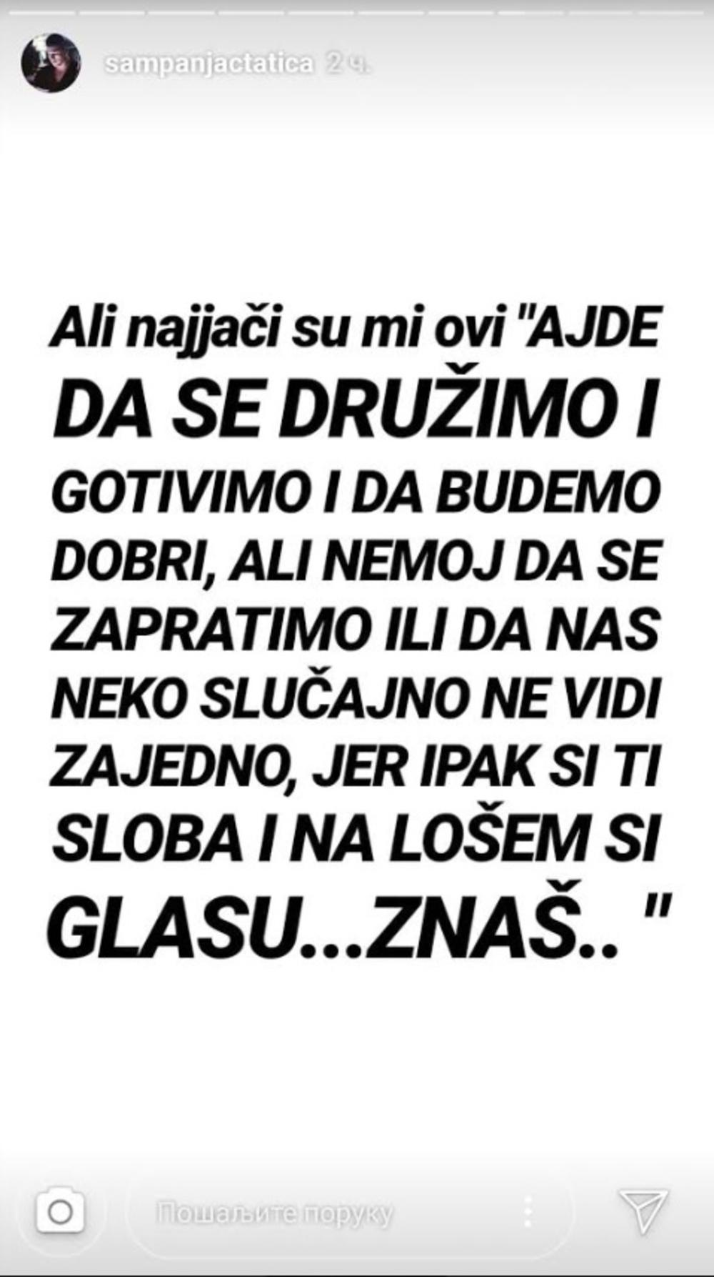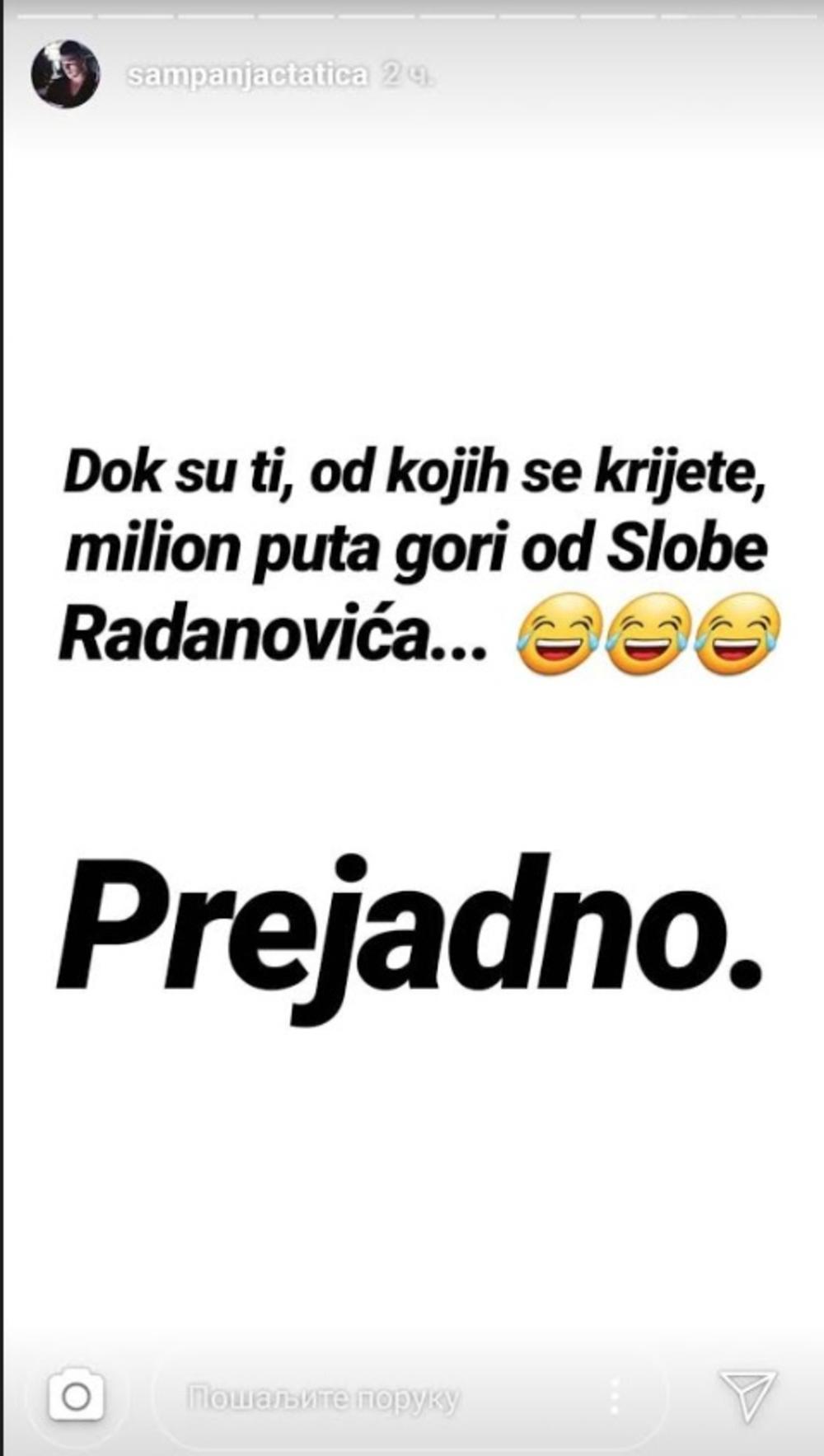 - Ali najjači su mi ovi "ajde da se družimo i gotivimo i da budemo dobri, ali nemoj da se zapratimo ili da nas neko slučajno ne vidi zajedno, jer ipak si ti Sloba i na lošem si glasu.. znaš.. - poručio je Radanović, a onda se nadovezao sledećom objavom: