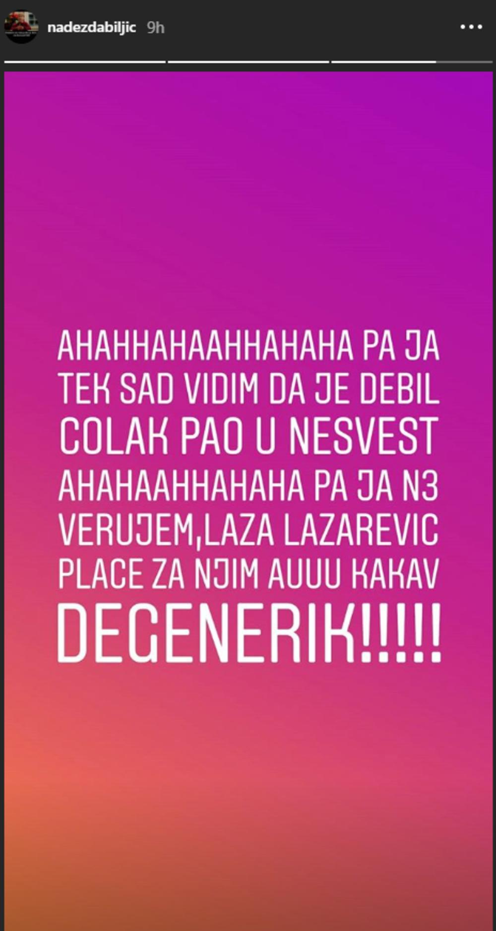 - Bane Čolak pod hitno da se prebaci iz "Zadruge" u Lazu Lazarević. Bože me sačuvaj kakav degenerik, patološki lažov i teški bolesnik! Reagujte ljudi, čovek ozbiljno nije u vinklu - napisala je Nadežda Biljić.