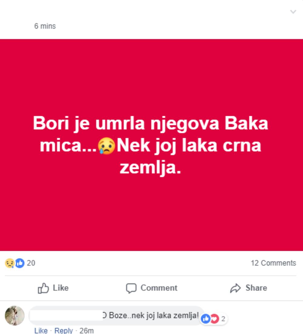 Na fejsbuk stranici Zadruga pojavila se vest da je Bori Santani umrla baka Mica za koju je jako vezan