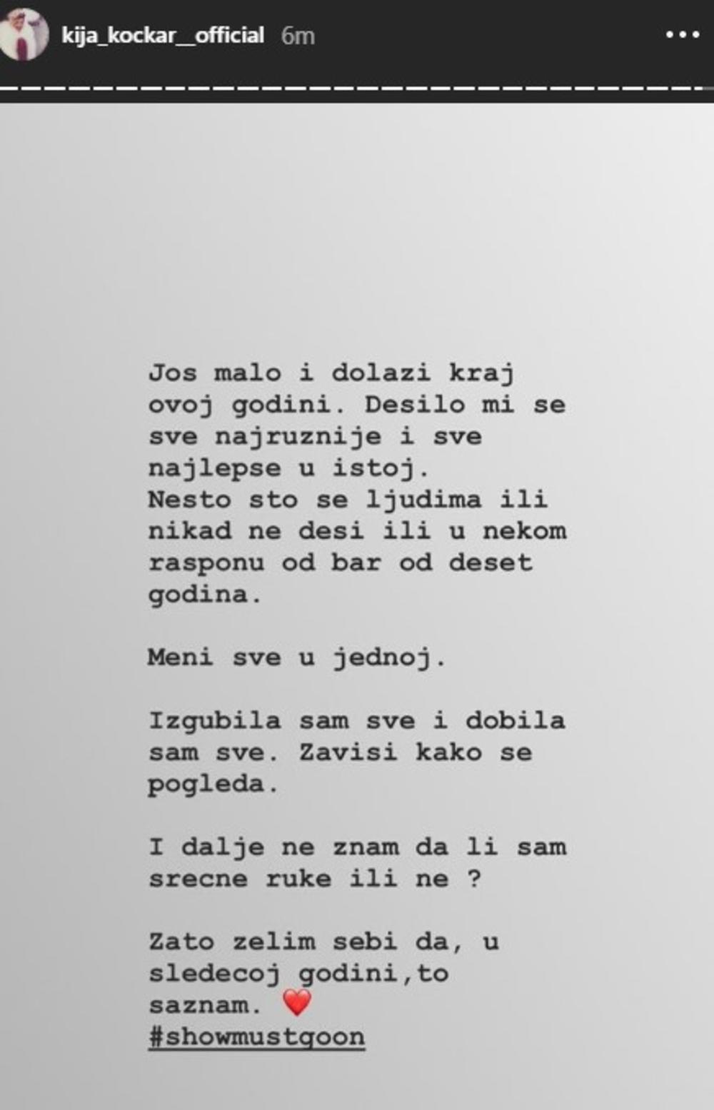 - Još malo i dolazi kraj ovoj godini. Desilo mi se sve najružnije i sve najlepše u istoj. Nešto što se ljudima ili nikad ne desi ili u nekom rasponu od bar od deset godina. Meni sve u jednoj. Izgubila sam sve i dobila sam sve. Zavisi kako se pogleda. I dalje ne znam da li sam srećne ruke ili ne? Zato želim sebi da, u sledećoj godini, to saznam - napisala je Kija.