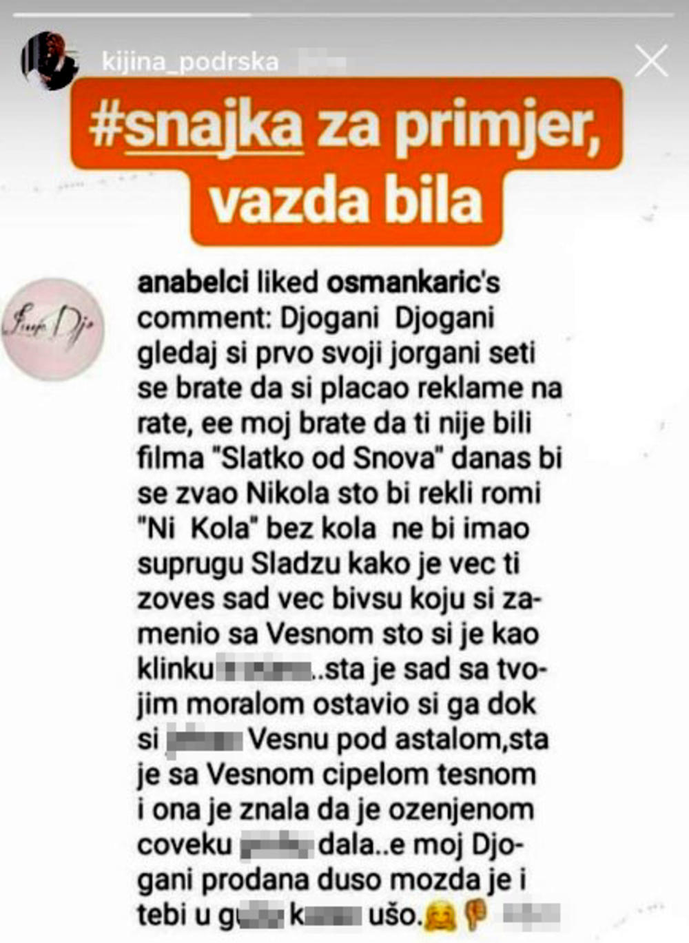 To je bio razlog da Anabela lajkuje komentar u kom blate Đoleta, zbog čega su je Kijini fanovi oštro osudili, napisavši da je "snajka za primer, vazda".