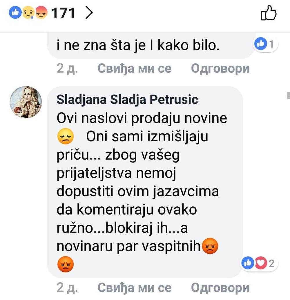 - Ovi naslovi prodaju novine. Oni samo izmišljaju priču. Zbog vašeg prijateljstva nemoj dopustiti ovim jazavcima da komentarišu ovako ružno, blokiraj ih. A novinaru par vaspitnih - napisala je Petrušićeva.