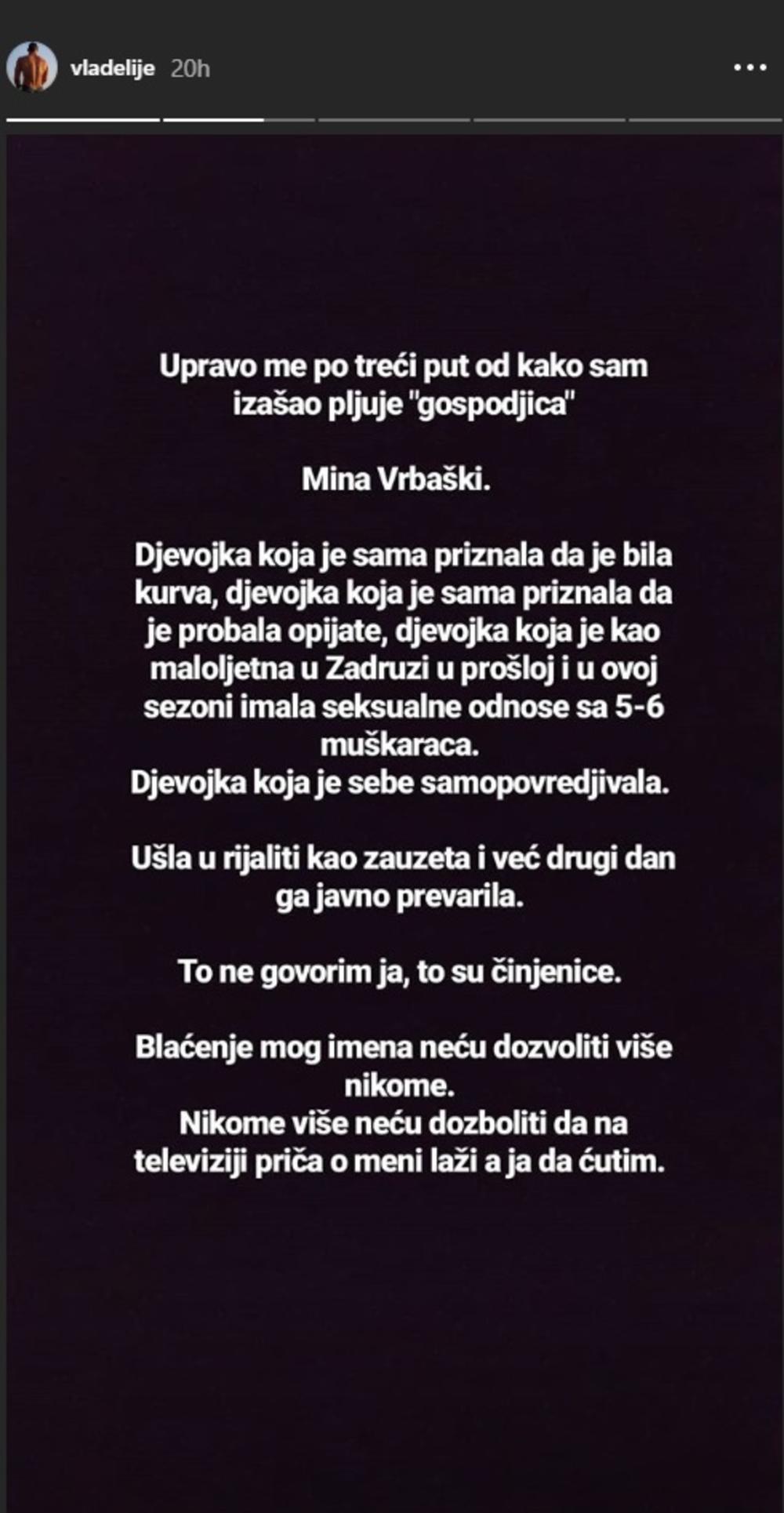 - Upravo me po treći put od kako sam izašao pljuje "gospođica" Mina Vrbaški. Devojka koja je sama priznala da je bila kur*a, devojka koja je sama priznala da je probala opijate, devojka koja je kao maloletna u Zadruzi u prošloj i u ovoj sezoni imala seksualne odnose sa 5-6 muškaraca. Devojka koja je sebe samopovređivala. Ušla u rijaliti kao zauzeta i već drugi dan ga javno prevarila. To ne govorim ja, to su činjenice. Blaćenje mog imena neću dozvoliti više nikome. Nikome više neću dozvoliti da na televiziji priča o meni laži, a ja da ćutim. - napisao je Vlada na svom Instagramu.
