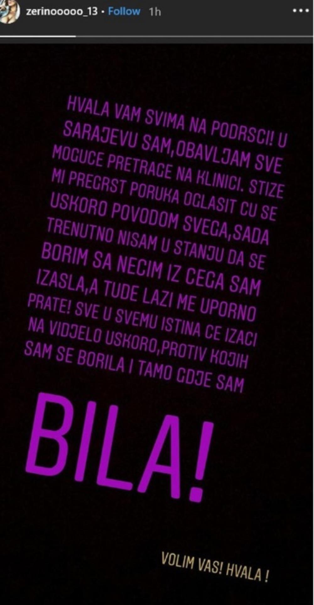 - Hvala vam svima na podršci, u Sarajevu sam, obavljam sve moguće pretrage na klinici - napisala je između ostalog Zerina Hećo.