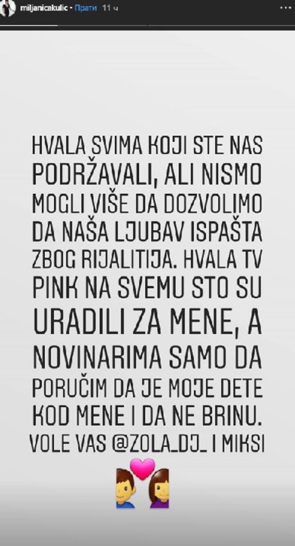 "Hvala svima koji ste nas podržavali, ali nismo mogli više da dozvolimo da naša ljubav ispašta zbog rijalitija", napisala je Miljana i dodala: