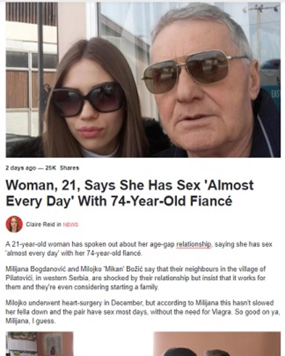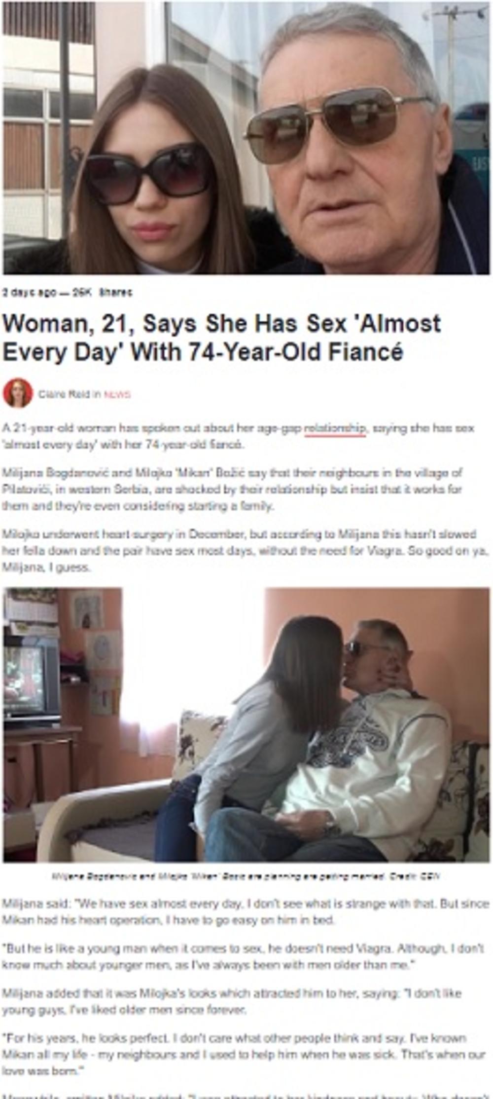 Jedna dvadesetdvogodišnja žena je progovorila je o odnosu sa svojim partnerom i razlici u godinama između njih dvoje, rekavši da ima seks "skoro svaki dan" sa svojim 74-godišnjim verenikom. Milijana Bogdanović i Milojko 'Mikan' Božić kažu da su njihovi susedi u selu Pilatovići, u zapadnoj Srbiji, šokirani njihovom vezom, ali insistiraju na tome da ona radi za njih i čak razmišljaju o osnivanju porodice. Milojko je u decembru prošao operaciju srca, ali, prema Milijani, ovo nije usporilo njenog momka, a par seksulane odnose može imati sasvim normalno i ne koristeći vijagru - nalazi se između ostalog u tekstu, koji britanci prenose na svom portalu u čudu, i to u okviru rubrike Svetske vesti.