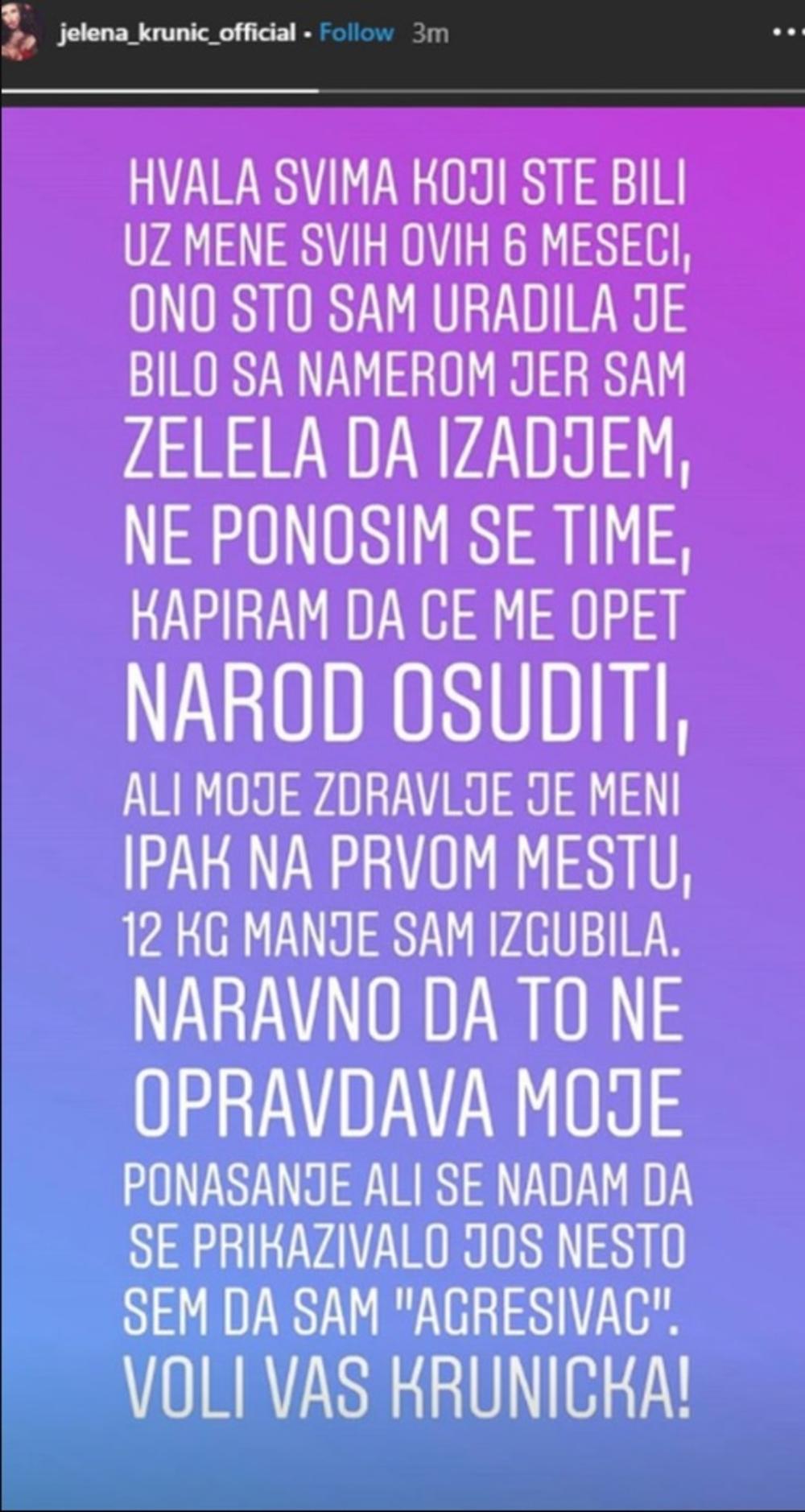 - Hvala svima koji ste bili uz mene svih ovih 6 meseci, ono što sam uradila je bilo sa namerom, jer sam želela da izađem. Ne ponosim se time, kapiram da će me opet narod osuditi, ali moje zdravlje je meni ipak na prvom mestu, 12 kilograma sam izgubila. Naravno da to ne opravdava moje ponašanje, ali se nadam da se prikazivalo još nešto osim da sam "agresivac" - napisala je Krunićeva na storiju i poručila fanovima da ih voli.