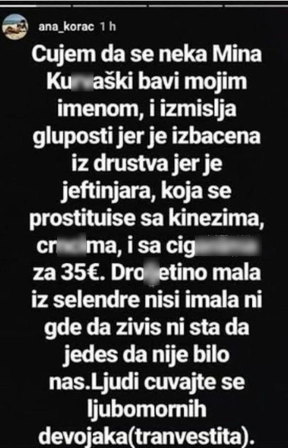 - Čujem da se neka Mina Kurvaški bavi mojim imenom i izmišlja gluposti, jer je izbačena iz društva, jer je jeftinjara koja se prostituiše sa Kinezima, crncima i sa Romima za 35 evra. Dro*etino mala iz selendare nisi imala gde da živiš ni šta da jedeš da nije bilo nas. Ljudi, čuvajte se ljubomornih devojaka (transvestita) - reči su Koraćeve koje je objavila tada u svojoj Instagram priči.