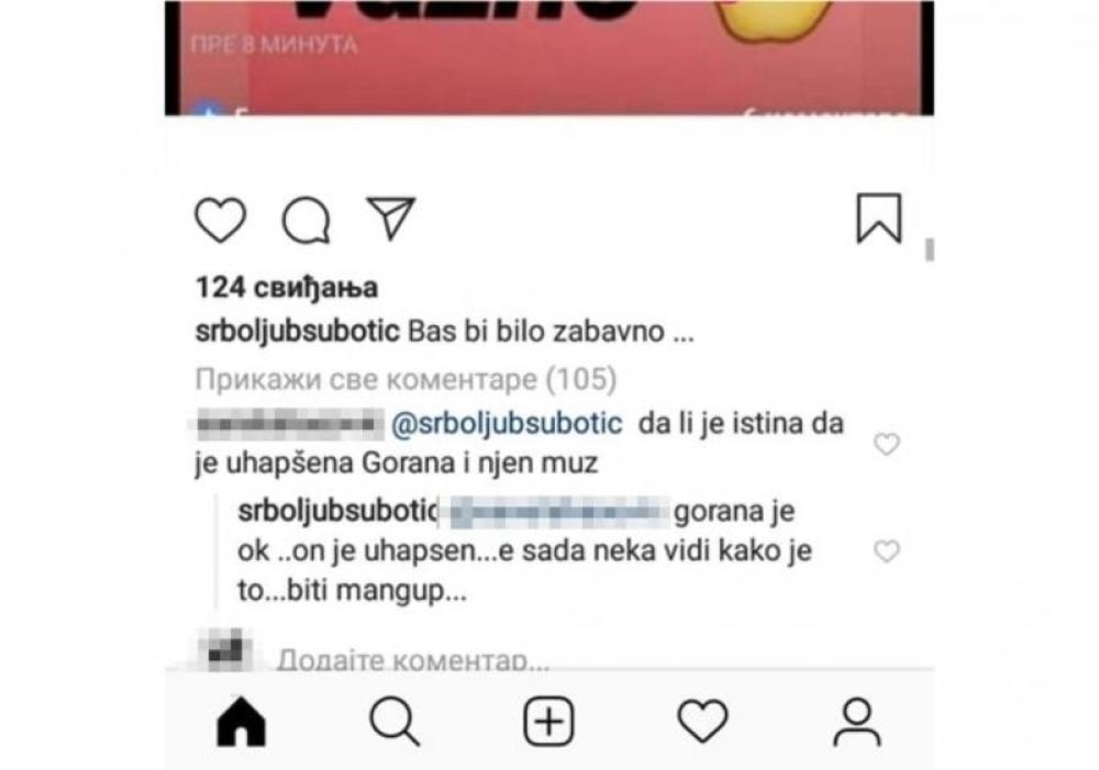 Srboljuba je ispod objave o navodnom ulasku u "Zadrugu 2" Predraga Opačića Mungosa, Davidovog poočima, jedan od pratilaca upitao "da li je istina da su Gorana i njen suprug uhapšeni", a on je odgovorio: