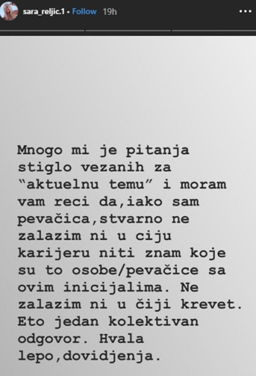 - Mnogo mi je pitanja stiglo vezanih za "aktuelnu temu" i moram vam reći da, iako sam pevačica, stvarno ne zalazim ni u čiju karijeru, niti znam koje su to osobe/pevačice sa ovim inicijalima. Ne zalazim ni u čiji krevet - objavila je Sara na društvenoj mreži.