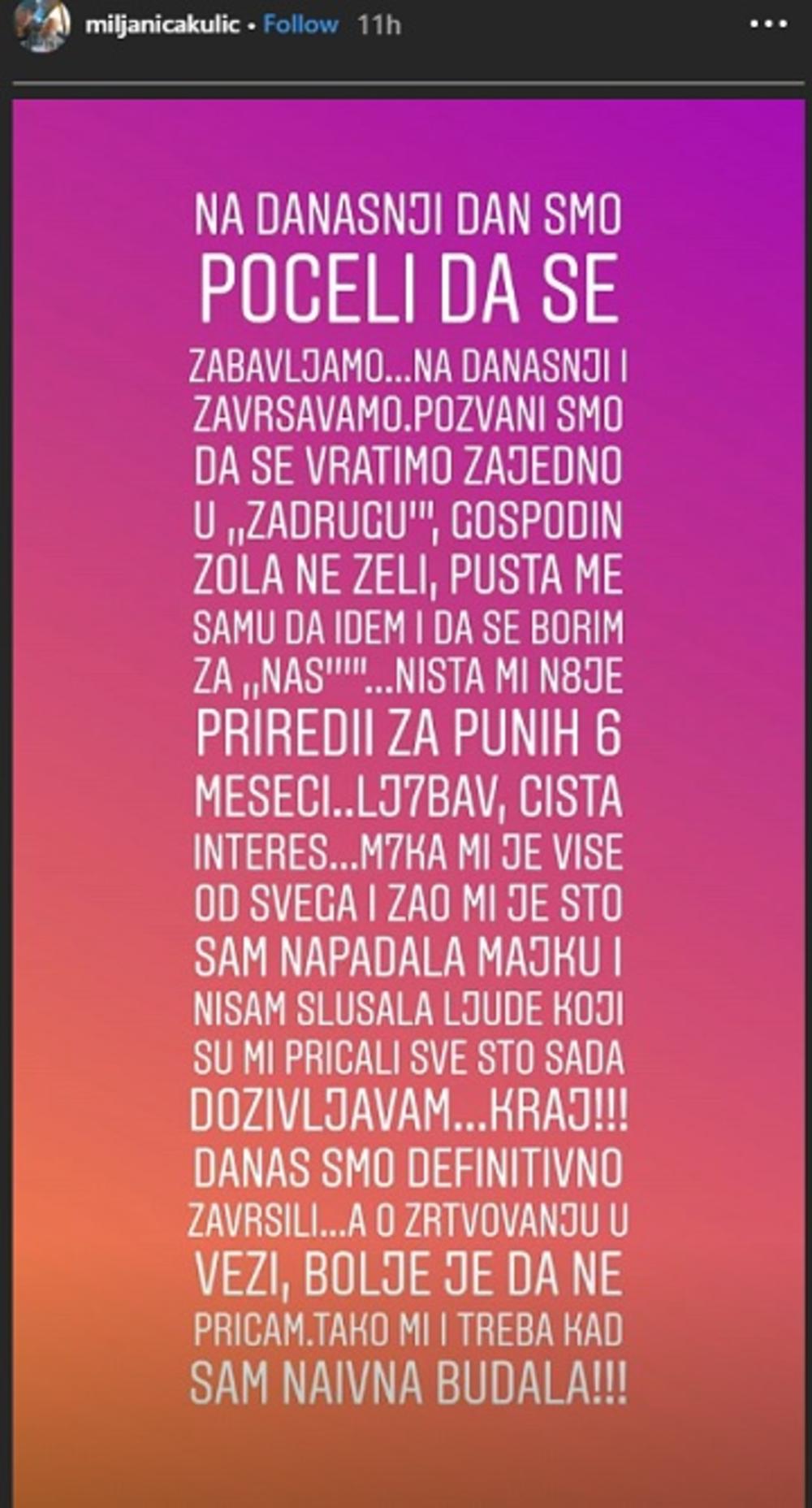 - Na današnji dan smo počeli da se zabavljamo. Na današnji dan i završavamo. Pozvani smo da se zajedno vratimo u "Zadrugu", gospodin Zola ne želi, pušta me samu da idem i da se borim za "nas". Ništa mi nije priredio za punih šest meseci. Ljubav, čisti interes... Muka mi je više od svega i žao mi je što sam napadala majku i nisam slušala ljude koji su mi pričali sve što sada doživljavam. Kraj! Danas smo definitivno završili... A o žrtvovanju u vezi bolje da ne pričam. Tako mi i treba kada sam naivna budala! - konstatovala je vidno neutešna i razočarana Miljana.