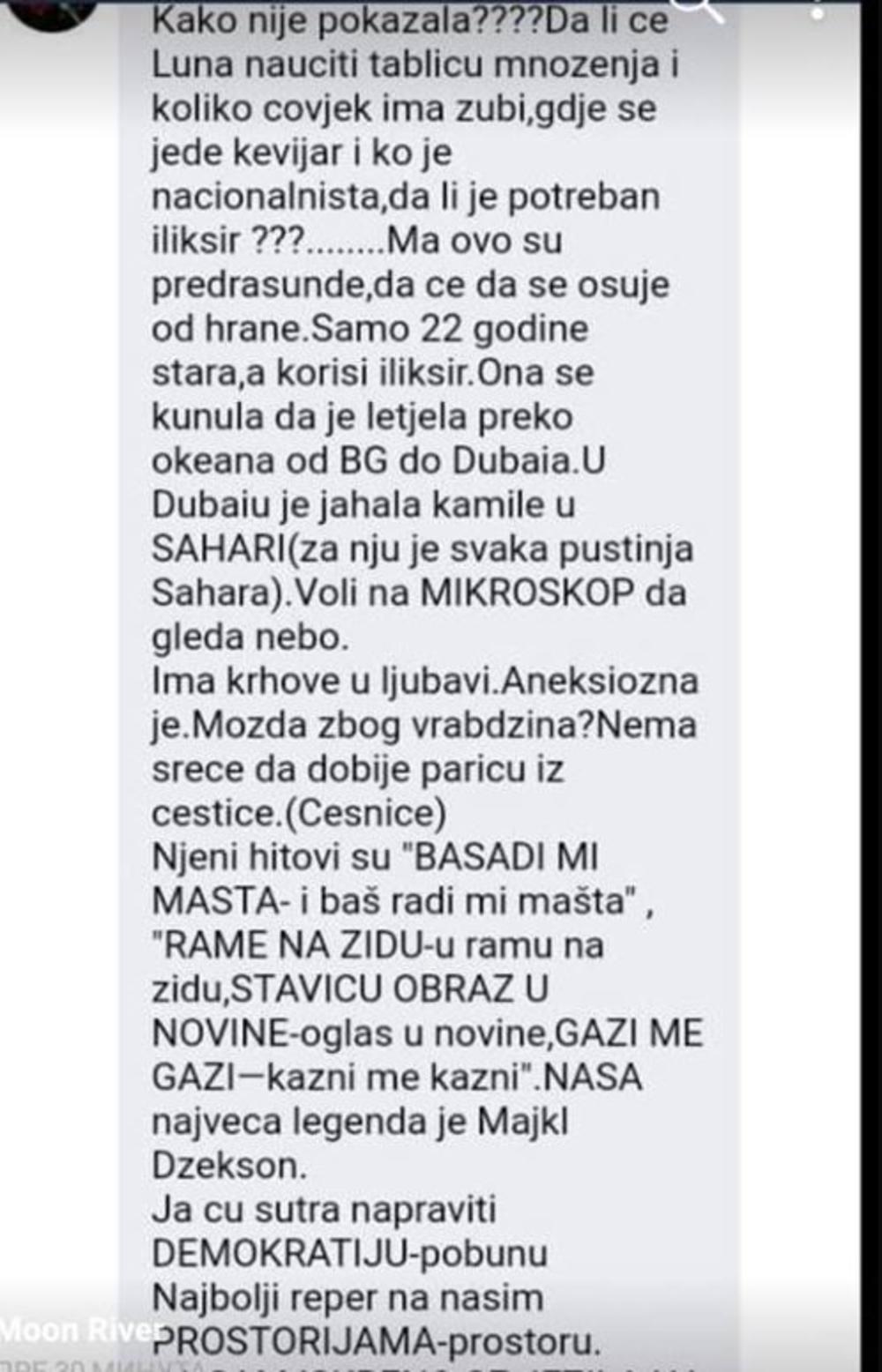 Da li će Luna naučiti tablicu množenja i koliko čovek ima zubi, gde se jede kevijar i ko je nacionalnista, da li je potreban iliksir???.... Ma ovo su predrasunde, de će da se osuje od hrane. Samo 22 godine stara, a korisi iliksir. Ona se kunula da je letela preko okeana od BG do Dubaija. U Dubaiju je jahala kamile u SAHARI (za nju je svaka pustinja Sahara). Voli na MIKROSKOP da gleda nebo. Ima krhove u ljubavi. Aneksiozna je. Možda zbog vrabdžina? Nema sreće da dobije paricu iz čestice (česnice). Njeni hitovi su "BASADI MI MAŠTA - i baš radi mi mašta", "RAME NA ZIDU - u ramu na zidu", "STAVIĆU OBRAZ U NOVINE - oglas u novine", "GAZI ME, GAZI - kazni me, kazni". NAŠA najveća legenda je Majkl Džekson. Ja ću sutra napraviti DEMOKRATIJU - pobunu. Najbolji reper na našim PROSTORIJAMA - prostoru", pobrojani su najsmešniji gafovi Lune Đogani.