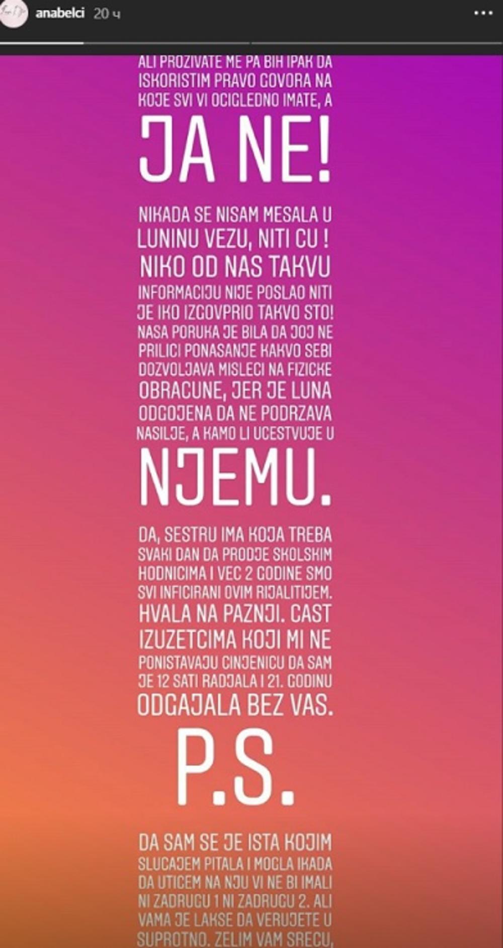 - Prozivate me, pa bih da iskoristim pravo govora na koje svi vi očigledno imate, a ja ne! Nikada se nisam mešala u Luninu vezu, niti ću! Niko od nas nije takvu informaciju poslao niti izgovorio takvo što! Naša poruka je bila da joj ne priliči ponašanje kakvo sebi dozvoljava misleći na fizičke obračune, jer je Luna odgojena da ne podržava nasilje, a kamoli učestvuje u njemu! - počela je Anabela.