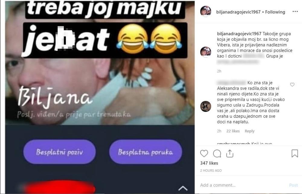 "Takođe grupa koja je objavila moj broj sa lično mog Vibera, ista je prijavljena nadležnim organima i moraće da snosi posledice kao i dotični ***. "
