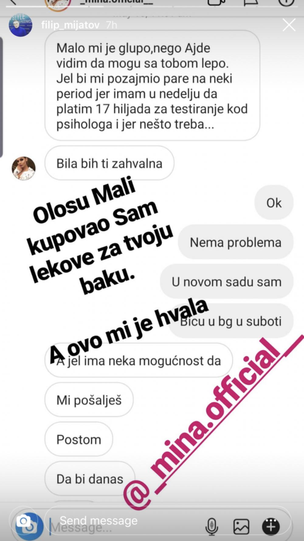 FILIP OPLEO I MINU: Pošto ga je JAVNO IZDALA, objavio prepisku kako INSISTIRA NA DRUŽENJU i MOLI GA ZA NOVAC (FOTO)