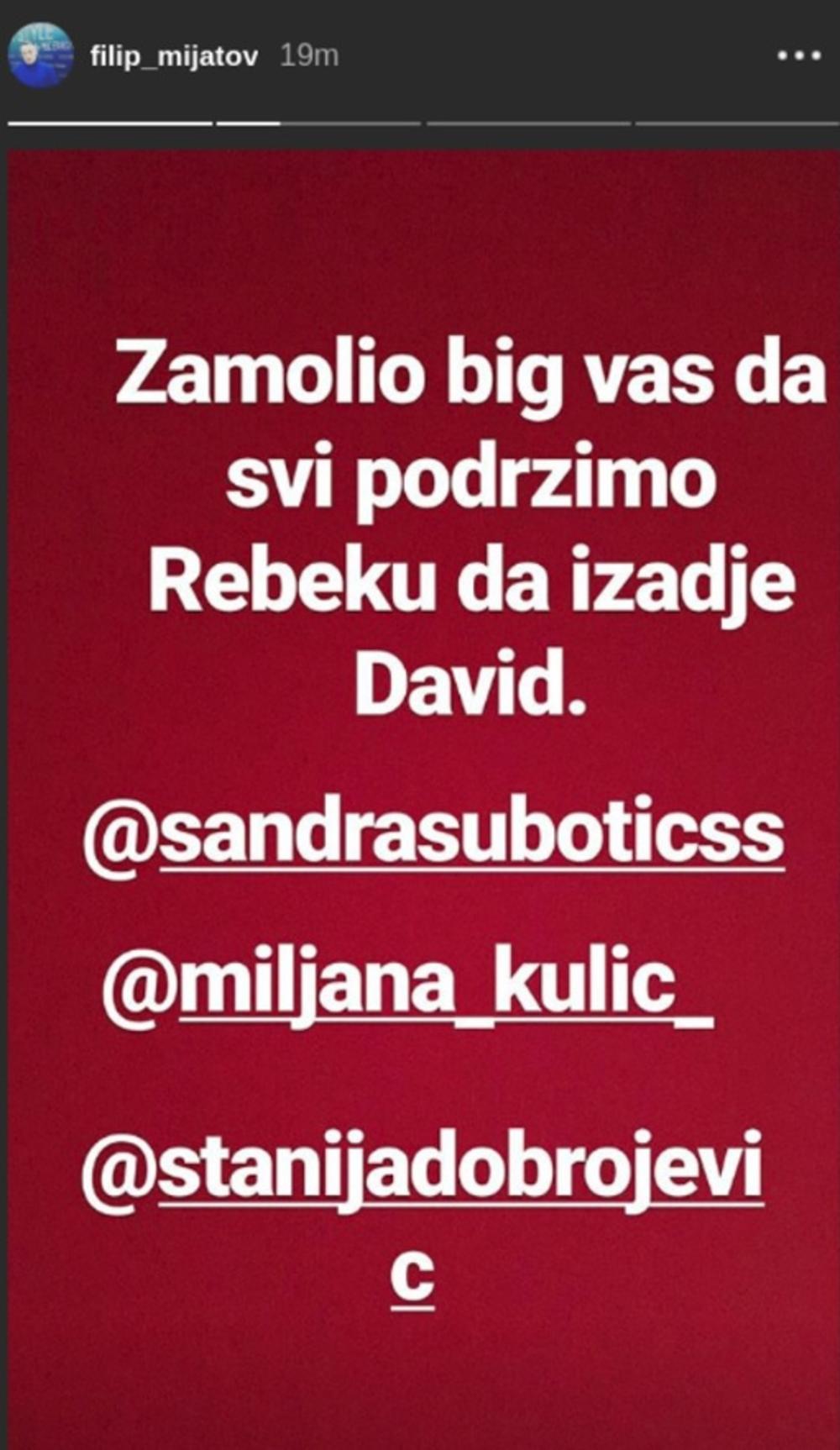 Naime, on je na svom Instagramu je nekoliko puta apelovao na fanove Zadruge da svoj glas daju Rebeki, kako bi ona zapravo ona ostala u takmičenju.