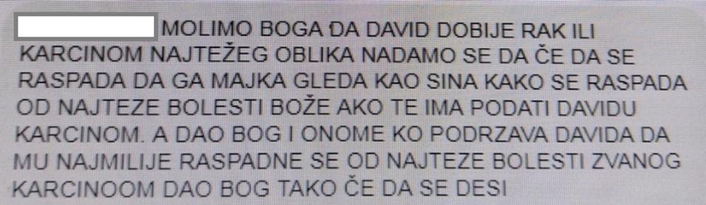 Molimo boga da David dobije rak ili karcinom najtežeg oblika. Nadamo se da će da se raspada da ga majka gleda kao sina kako se raspada od najteže bolesti. Bože, ako te ima, podari Davidu karcinom! A dao bog i onome ko podržava Davida da mu se najmiliji raspadnu od najteže bolesti zvane karcinom, dao bog tako će da se desi", stoji u jezivoj poruci na društvenoj mreži, koja je zgrozila ne samo Davidove fanove, već i sve one zdravog razuma, bilo da im je Dragojević simpatičan ili antipatičan.