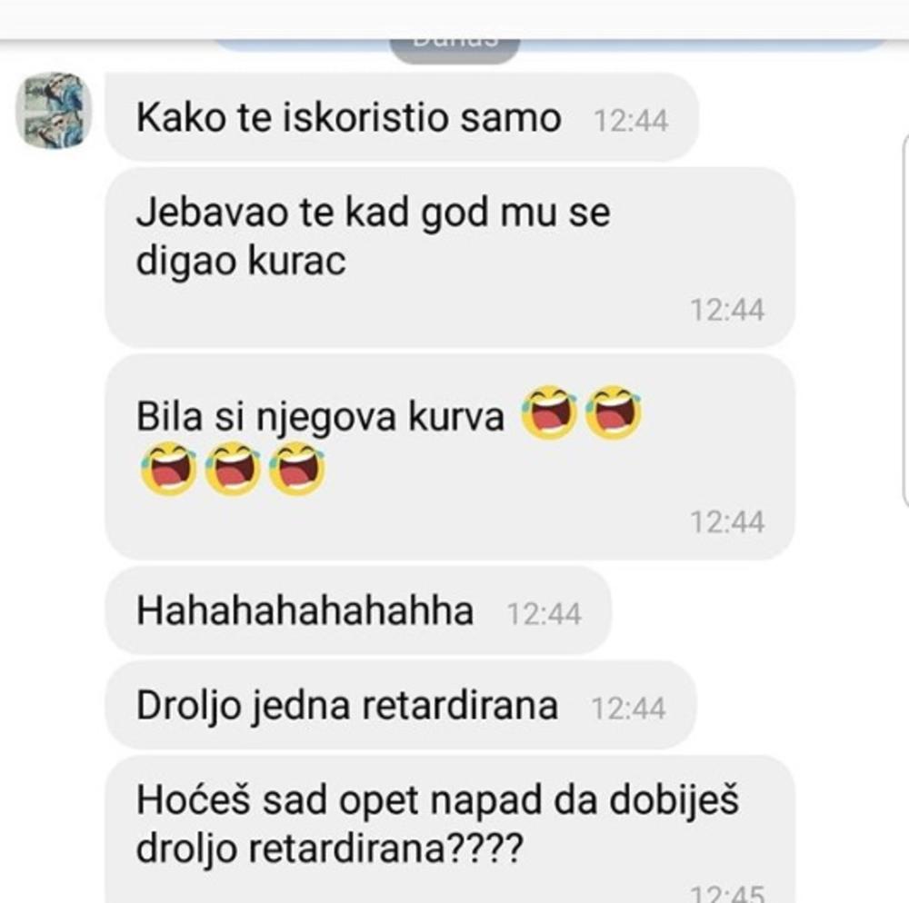 - Kako te je samo iskoristio, je*avao te kad god mu se di*ao ku*ac. Bila si njegova ku*va, dro*o retardirana. Hoćeš sad opet napad da dobiješ?