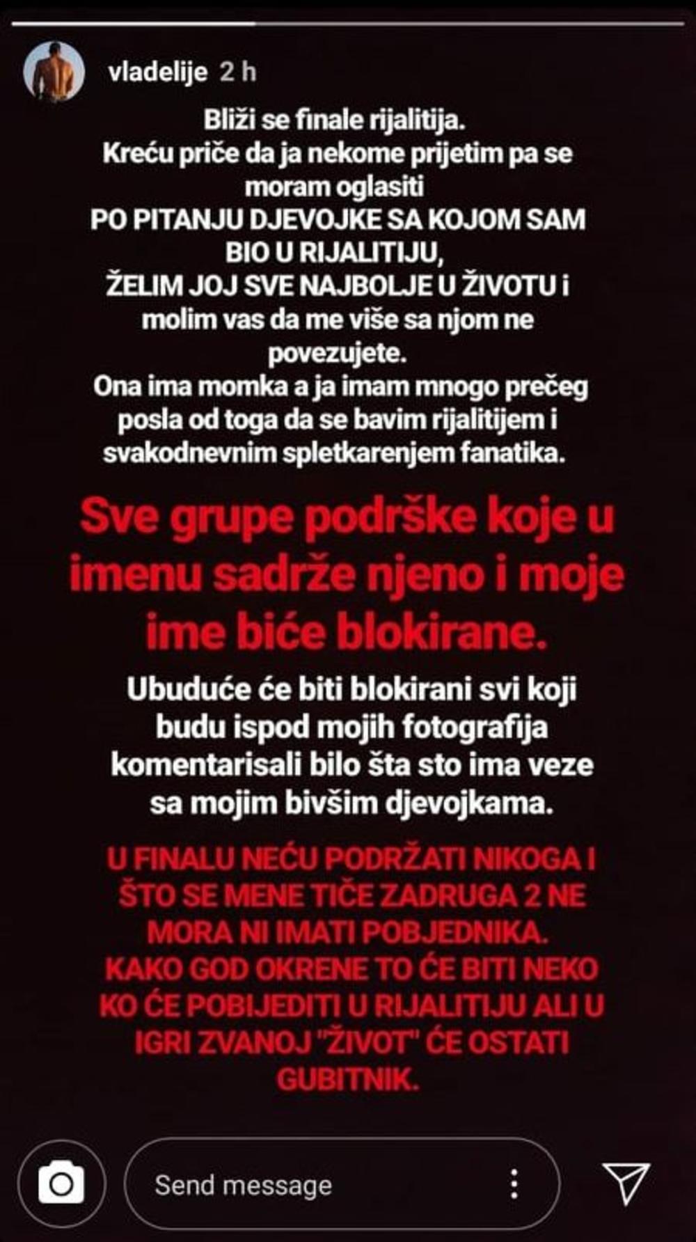 "Bliži se finale rijalitija. Kreću priče da ja nekome pretim, pa moram da se oglasim povodom devojke sa kojom sam bio u rijalitiju (Stanija Dobrojević). Želim joj sve najbolje u životu i molim vas da me više ne povezujete sa njom. Ona ima momka, a ja imam mnogo preča posla od toga da se bavim rijalitijem i svakodnevnim spletkarenjem fanatika. Sve grupe podrške koje u imenu sadrže njeno i moje ime biće blokirane. Ubuduće će biti blokirani i svi oni koji ispod mojih fotografija budu komentarisali bilo šta što ima veze sa mojim bivšim devojkama. U finalu neću podržati nikoga i što se mene tiče Zadruga 2 ne mora ni da ima pobednika. Kako god (se) okrene, to će biti neko ko će pobediti u rijalitiju ali u igri zvanoj 'život' će ostati gubitnik", zaključio je Vladimir.