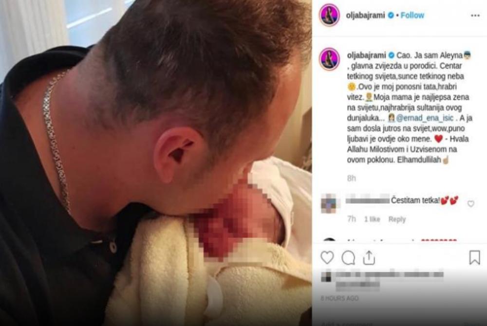 - Ćao. Ja sam Alejna, glavna zvezda u porodici. Centar tetkinog sveta, sunce tetkinog neba. Ovo je moj tata. Hrabri vitez. Moja mama je najlepša žena na svetu, najhrabrija sultanija ovog dunjaluka. A ja sam došla jutros na svet, vau, puno ljubavi je ovde oko mene. Hvala Allahu Milostivom i Uzvišenom na ovom poklonu - napisala je Olja u opisu fotografije.