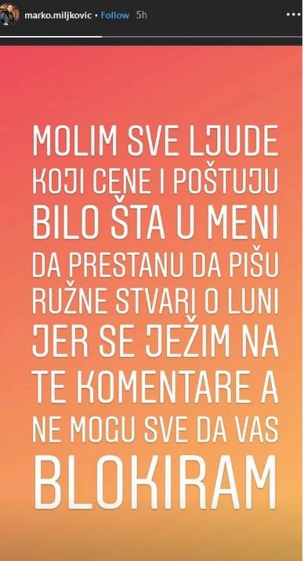 Marko Miljković je odlučio da stane na kraj lošim komentarima na račun Lune, pa se tokom prethodne noći obratio svojim pratiocima i ljudima koji ga podržavaju i zamolio ih da mu ne šalju ružne komentare o njoj, te time stao u odbranu svoje doskorašnje devojke.