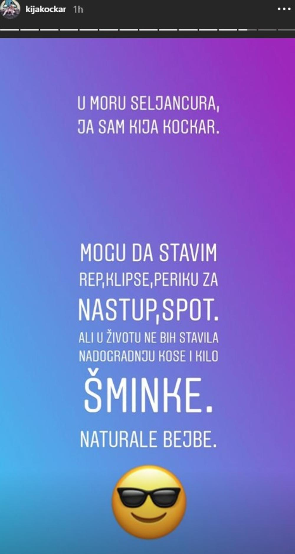 "U moru seljančura, ja sam Kija Kockar. Mogu da stavim rep, klipse, periku za nastup, spot. Ali u životu ne bih stavila nadogradnju kose i kilo šminke. Naturale bejbe", napisala je pobednica prve sezone rijalitija "Zadruga".