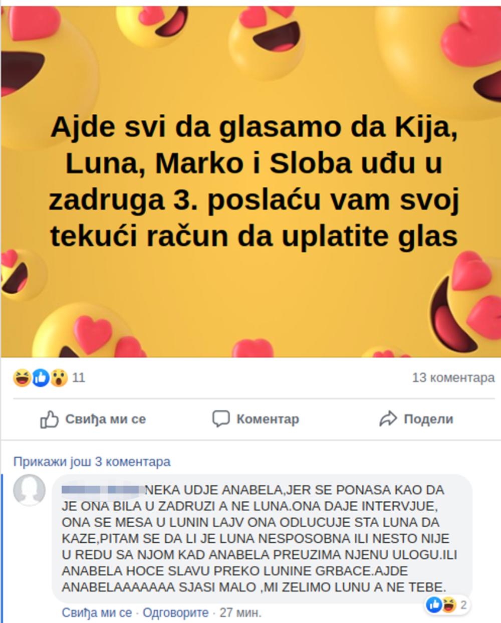 - Ajde da svi glasamo da Kija, Luna, Marko i Sloba uđu u Zadrugu 3, poslaću vam svoj tekući račun da pošaljete glas - neko se ironično našalio, a u komentaru ispod neko je ostavio komentar da bi Anabela trebala da uđe u Zadrugu jer ona zna najbolje i meša se u Lunin život.