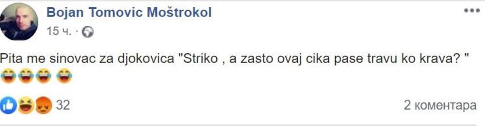 Bojan Tomović je na društvenoj mreži Fejsbuk, gde je veoma aktivan, posle pobede na Vimbldonu Novaka Đokovića napisao sraman status.