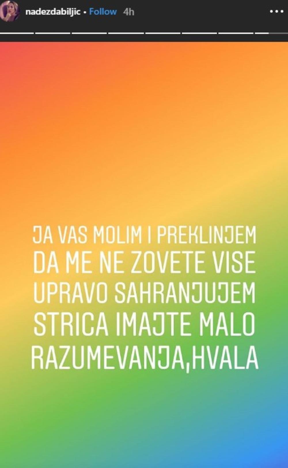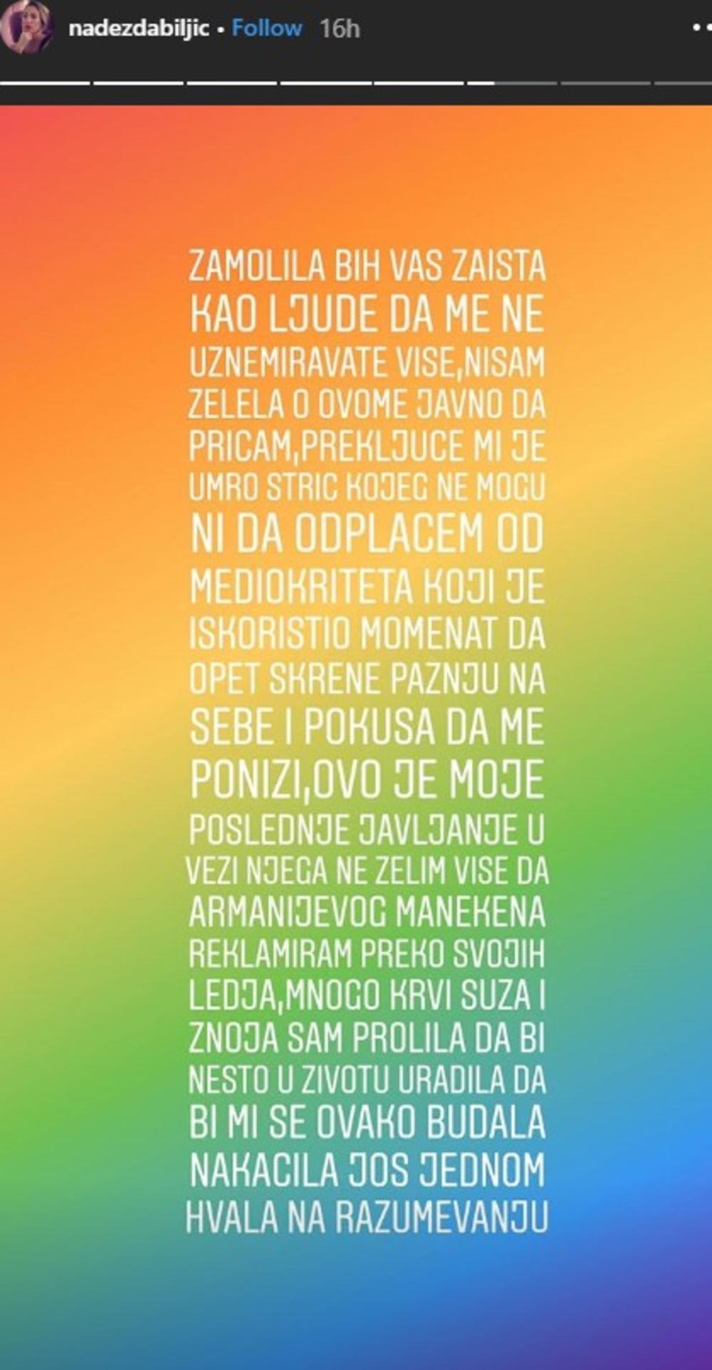 Zamolila bih vas zaista da me ubuduće ne uznemiravate više, nisam želela o ovome javno da pričam, prekjuče mi je umro stric kojeg ne mogu ni da otplačem od mediokriteta koji je iskoristio momenat da opet skrene pažnju na sebe i pokuša da me ponizi. Ovo je moje poslednje javljanje u vezi njega, ne želim više da manekena reklamiram preko svojih leđa, mnogo krvi, suza i znoja sam prolila da bih nešto u životu uradila da bi mi se budala ovako nakačila. Hvala na razumevanju", napisala je Nadežda.
