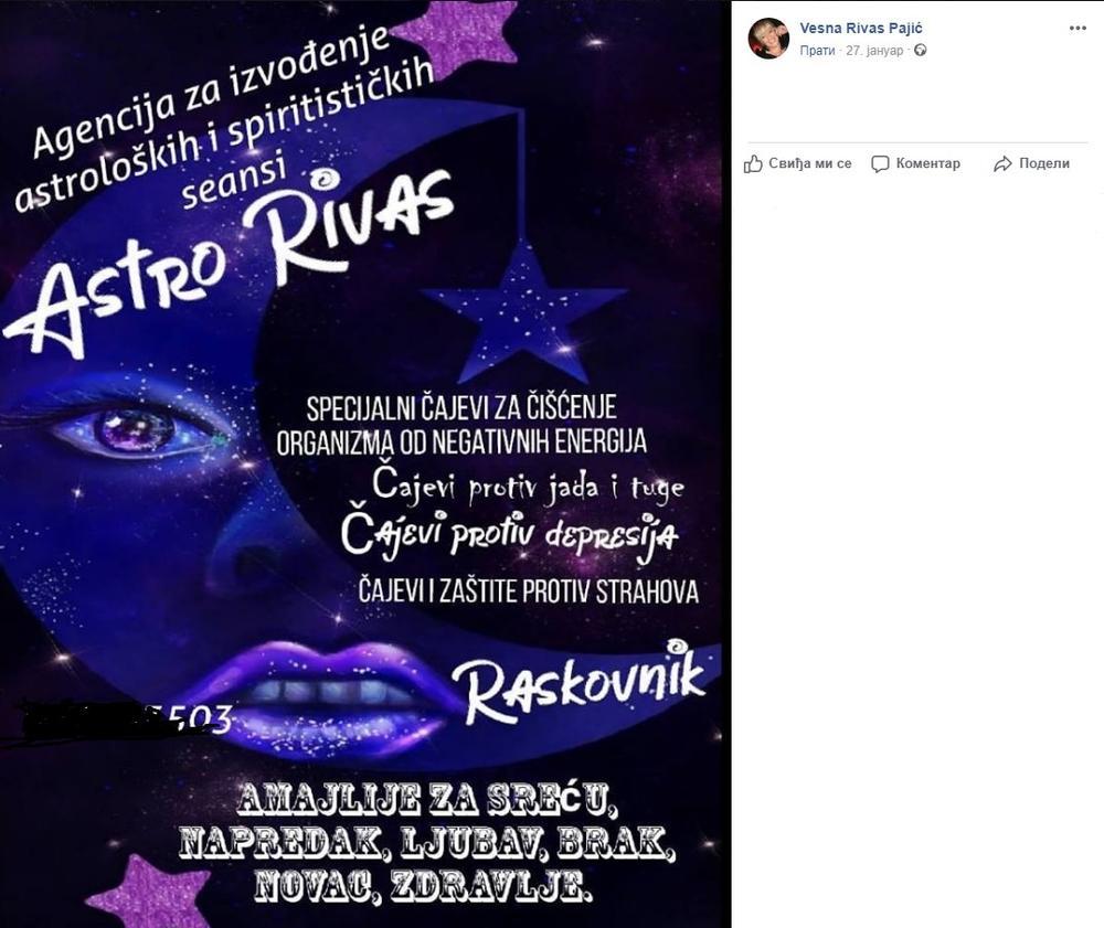 "Specijalni čajevi za čišćenje organizma od negativnih energija. Čajevi protiv jada i tuge, čajevi protiv depresije, čajevi i zaštite protiv strahova. Amajlije za sreću, napredak, ljubav, brak, novac, zdravlje. Telefonske konsultacije iz celog sveta, samo jedno pitanje 50 evra", piše u oglasu objavljenom na Vesninom Fejsbuk profilu.