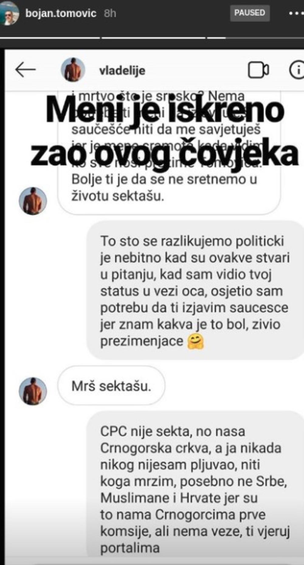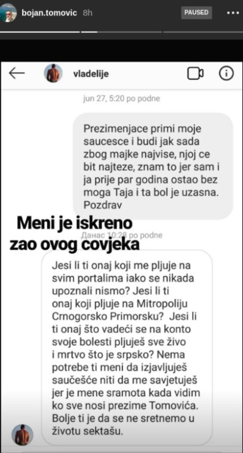 Naime, putem Instagrama izjavio saučešće Vladimiru Tomoviću za smrt oca, s kojim, osim istog prezimena, nema ništa zajedničko.