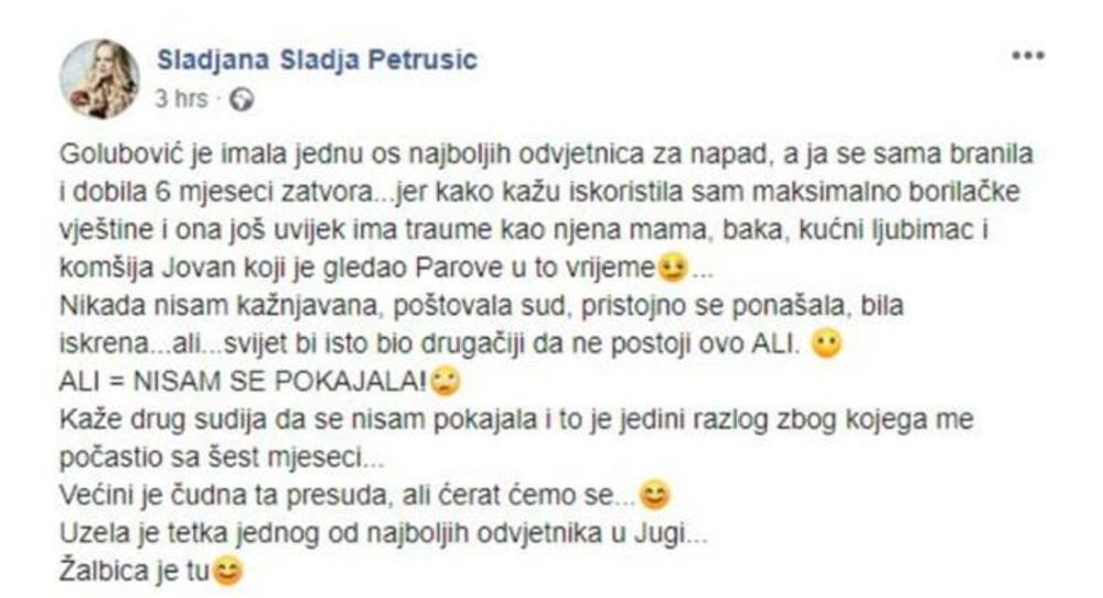 Golubovićeva je imala jednog od najboljih advokata za napad, a ja se sama branila i dobila šest meseci zatvora. Jer, kako kažu, iskoristila sam maksimalno borilačke veštine i ona još uvek ima traume kao njena mama, baka, kućni ljubimac i komšija Jovan, koji je gledao "Parove" u to vreme", napisala je između ostalog Slađa, dok ceo post možete pročitati na slici ispod.
