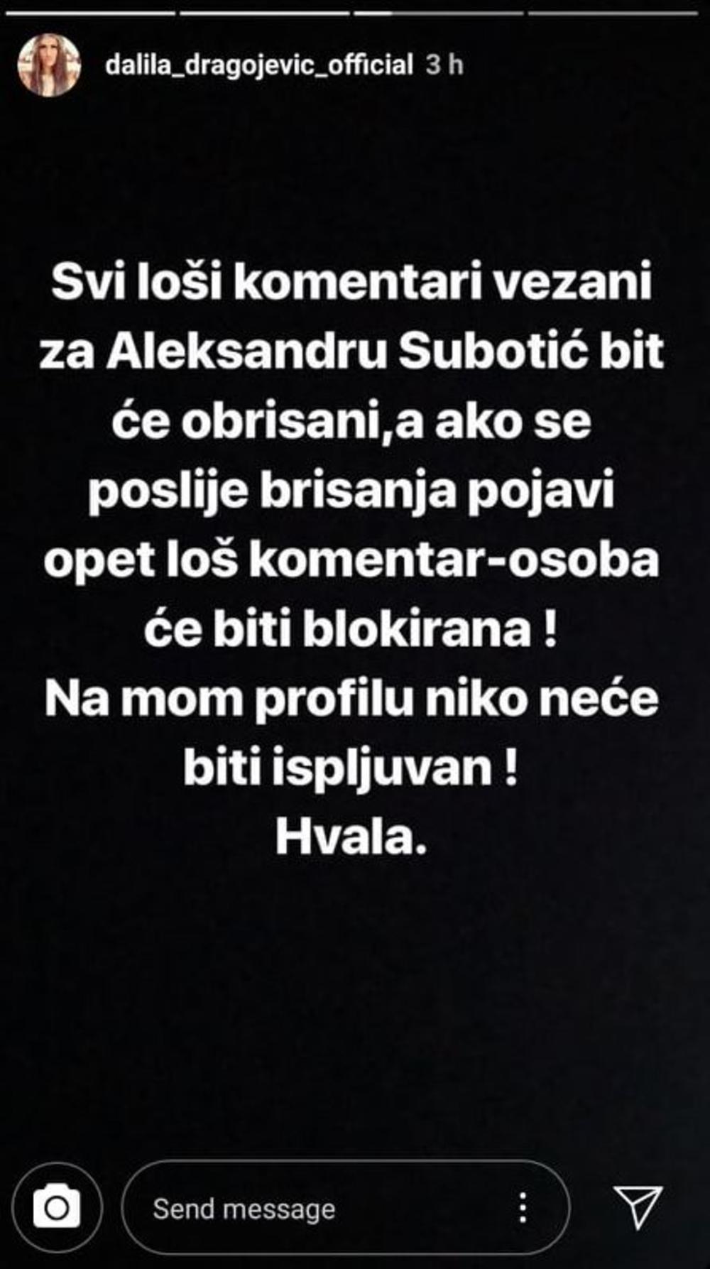 "Svi loši komentari vezani za Aleksandru Subotić biće obrisani, a ako se posle brisanja pojavi opet loš komentar - osoba će biti blokirana! Na mom profilu niko neće biti ispljuvan! Hvala", poručila ona te dokazala da je, bez obzira na sve, izuzetno protiv ružnog ponašanja na društvenim mrežama, kao i uvreda koje su upućene Davidovoj bivšoj.