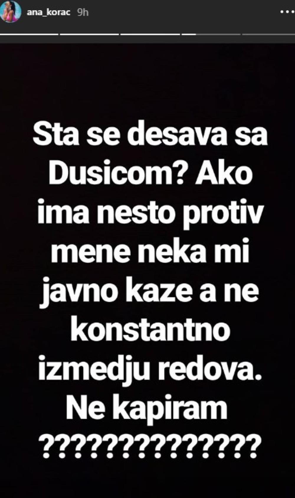 "Šta se dešava sa Dušicom? Ako ima nešto protiv mene, neka mi javno kaže, a ne konstantno između redova. Ne kapiram?", napisala je Ana na svom Instagramu, ali je ostala uskraćena odgovora.